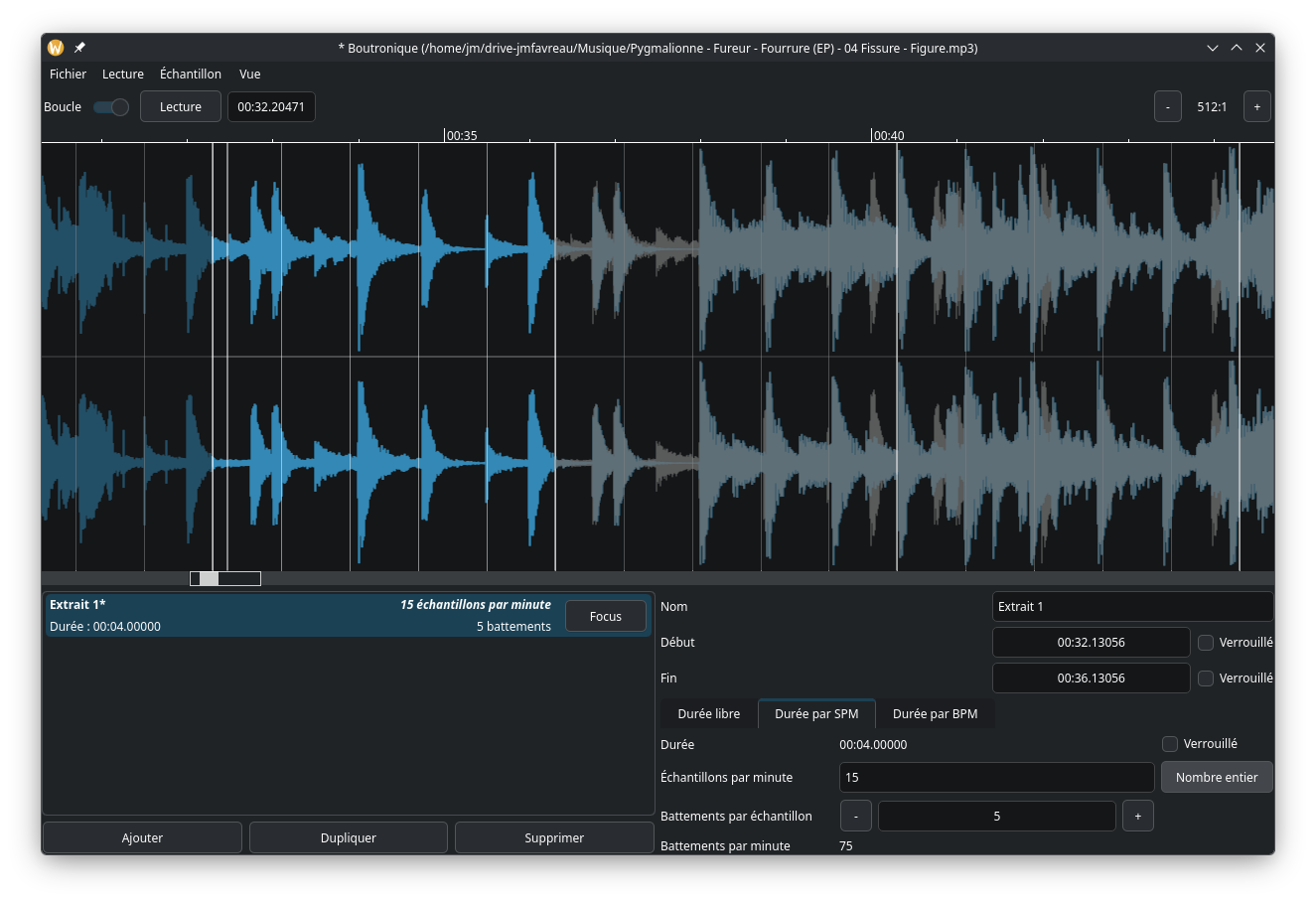 Après avoir cherché pendant quelques temps l’outil idéal pour partir à la chasse aux samples, j’ai fini par me relever les manches il y a quelques semaines, et j’ai commencé à coder un outil qui s’appelle Boutronique. J’ai imaginé un outil simple, qui fait une chose, et se concentre pour le faire de manière efficace : sélectionner des samples depuis une source audio et les extraire simplement. Évidemment, il est très bien adapté au S‑4 : parmi les exports, j’ai bien sûr implémenté le format wav avec échantillonnage 48000 Hz, et un nom de fichier contenant le BPM pour que le S‑4 puisse le prendre en charge nativement.